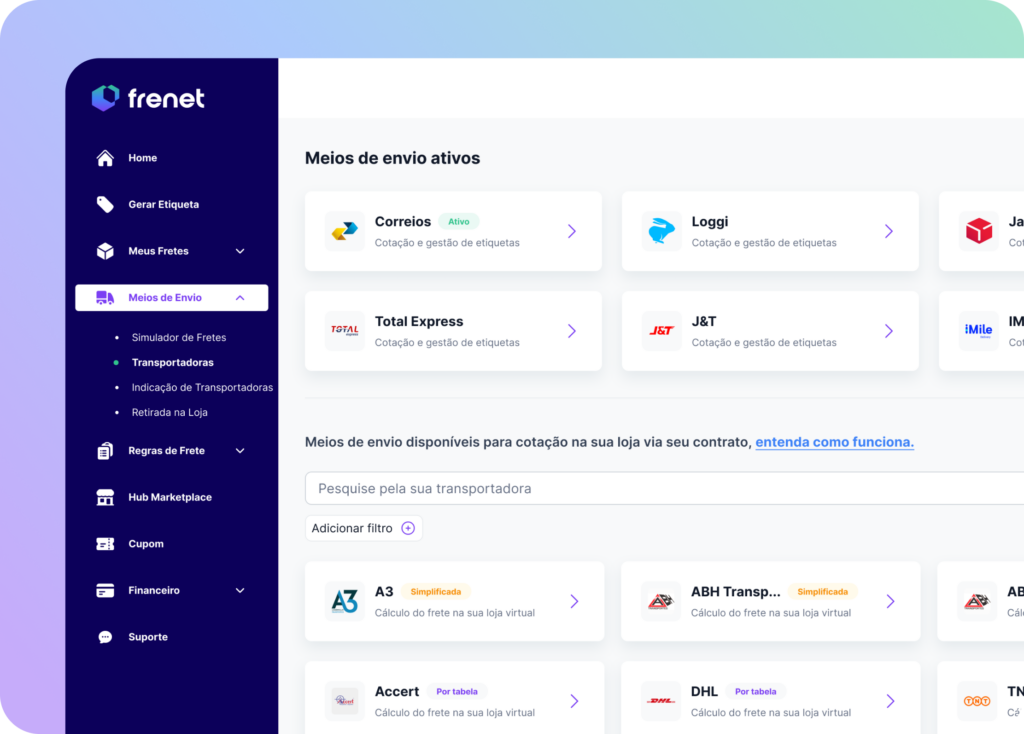 Acesso a transportadoras já integradas, sem necessidade de negociação individual com cada uma.